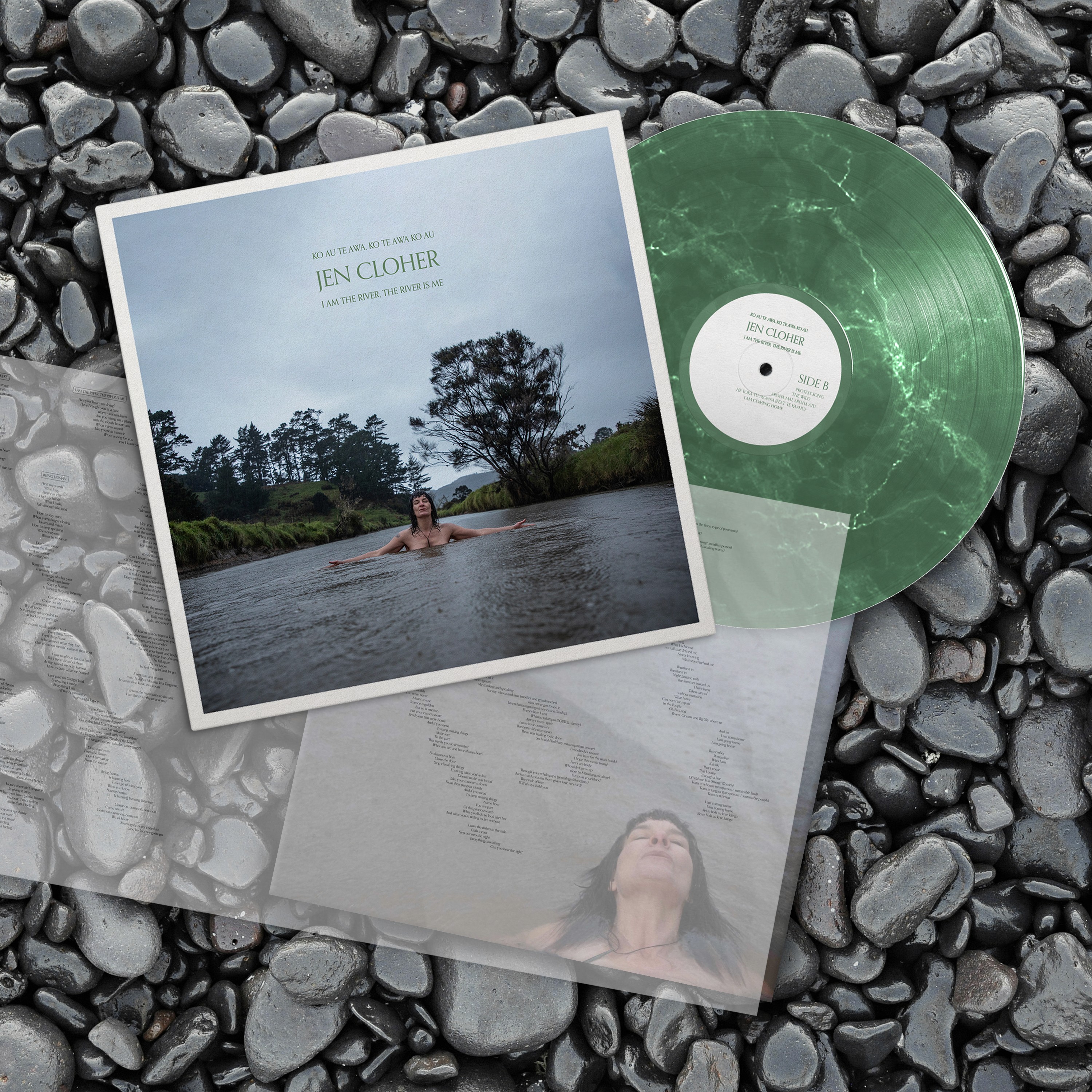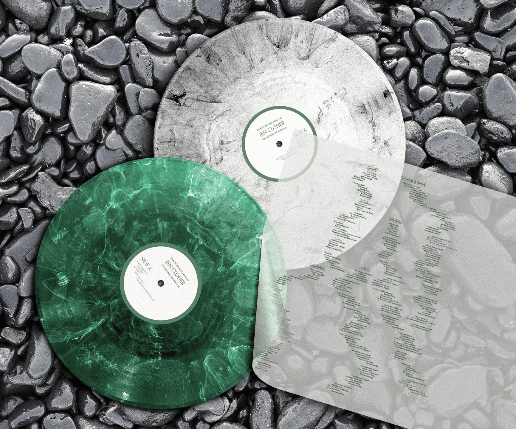 Working closely with Jen we began a beautiful collaboration to capture the beauty of her lyricism, the cultural significance and symbology of the album. We began looking to the water, landscapes and rivers of New Zealand and the culturally significant stone, pounamu (a type of jade) that is sacred to her and her Māori ancestors. The outcome developed into a typographic and photographic focused design. Finding inspiration in the green of the pounamu stone, we created a green marbled vinyl and further brought the green into meandering typography across the vinyl and campaign. The resulting design confidently embraces the quiet of negative space and typographic poetry. I made the decision to print the vinyl’s lyrics sheet onto tracing paper, enveloping the inner sleeve of the vinyl, to create layers of transparency within the design. The resulting layers of typography and photography create meandering rivers of consciousness and contemplativeness, of the past and present political and cultural currents, seen in Aotearoa (New Zealand).